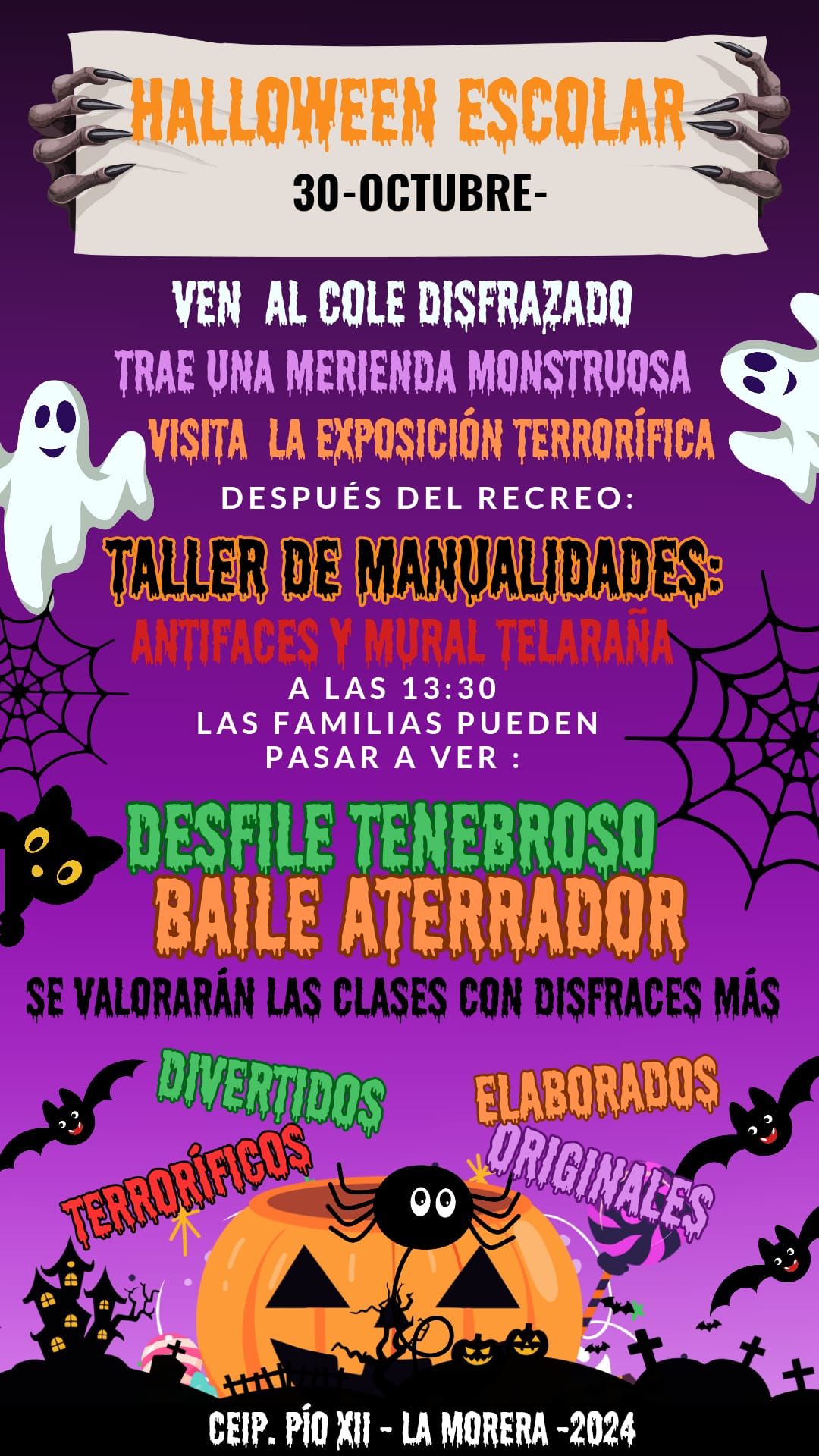 Este 30 y 31 de octubre, celebramos Halloween.Se ha celebrado tanto la festividad del Día de Todos los Santos como la de Halloween,en el colegio con unos días lleno de creatividad, diversión y sorpresas en todas las etapas. Desde Infantil hasta Primaria, cada rincón se transformó para recibir esta fiesta tan especial con actividades únicas que hicieron de las jornadas un auténtico éxito.
